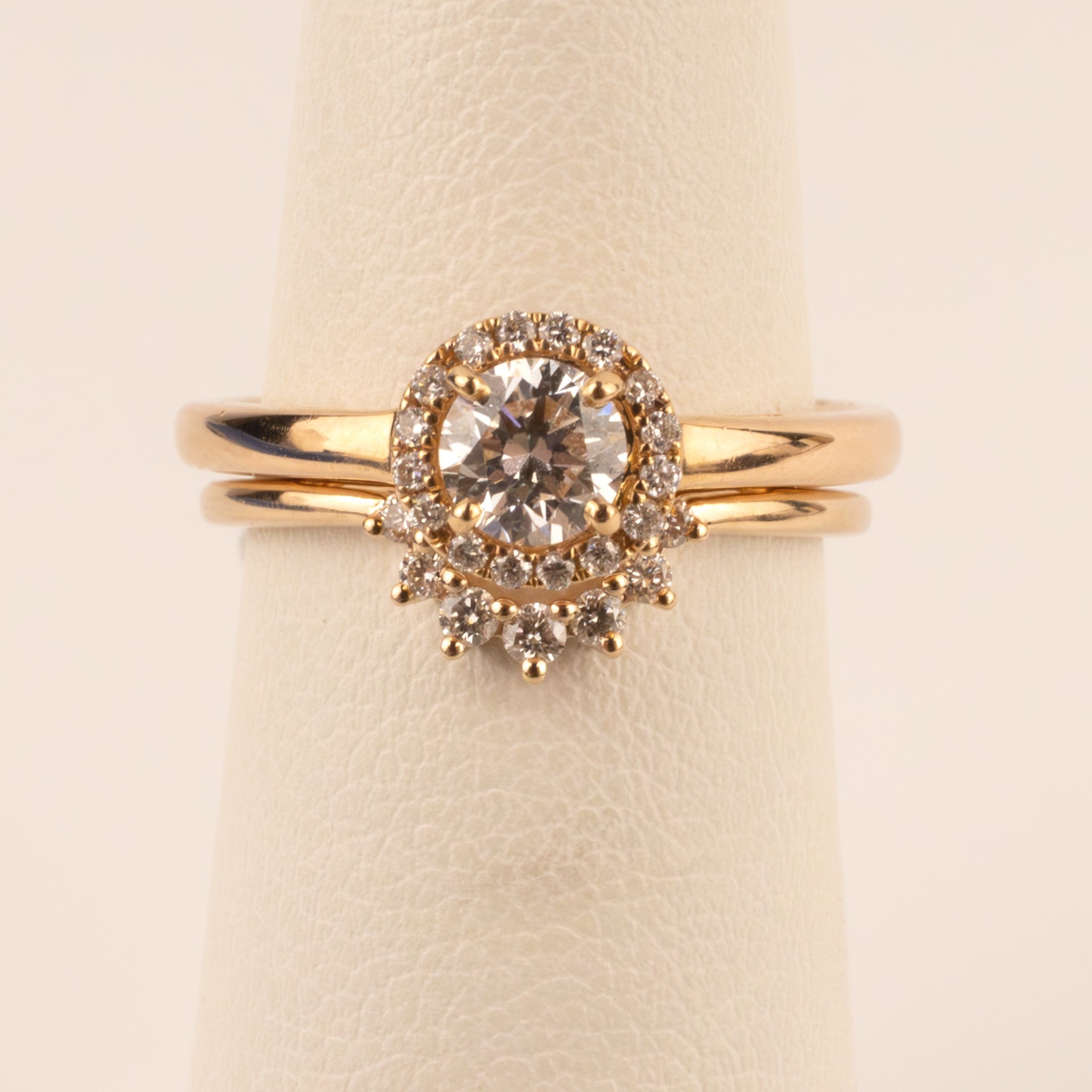 Seven diamonds are set in 14k rose gold. There are 0.9 total carat weight of diamonds. The ring is designed to enhance an engagement ring. See last photo for example.