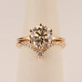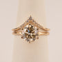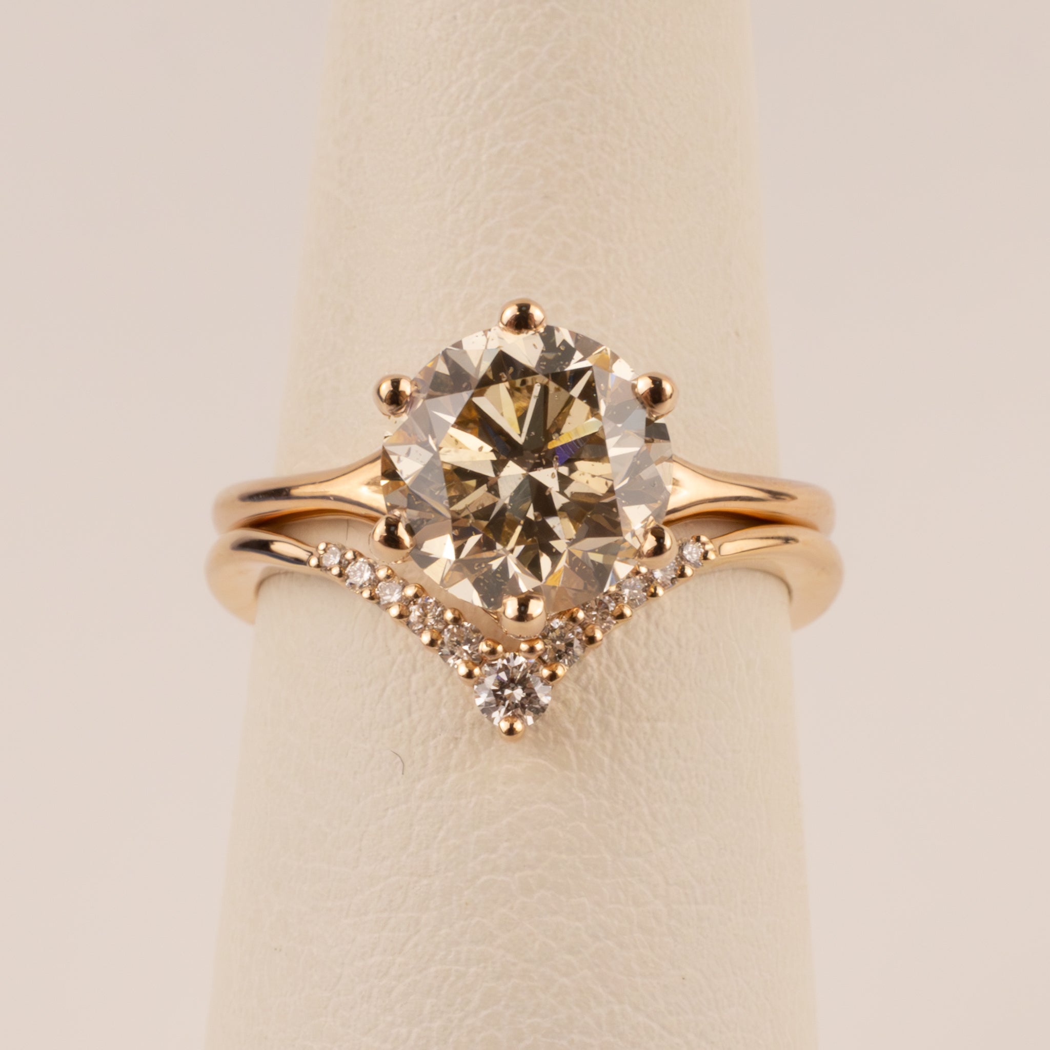 Diamonds are shared prong set in 14k rose gold. There are 0.12 total carat weight of diamonds. See photos for how to be paired with an engagement ring.