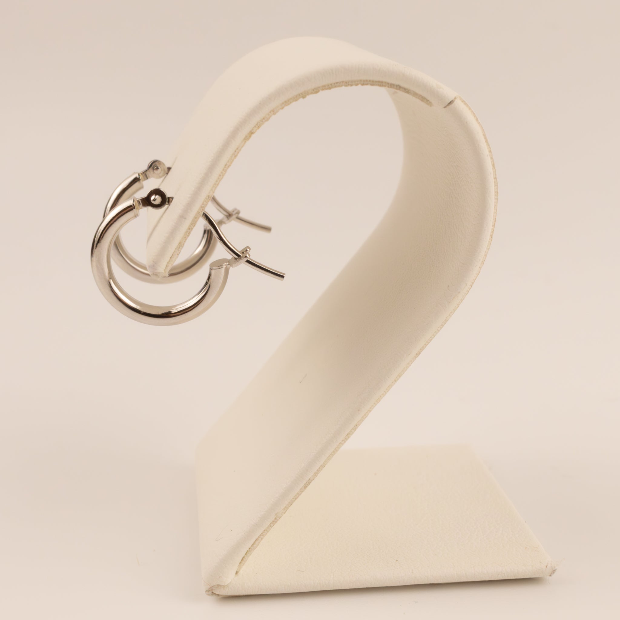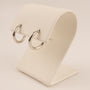 Huggies are made of 14k white gold. They measure 2mm wide and 12mm long. The earrings feature a post and notch closure.