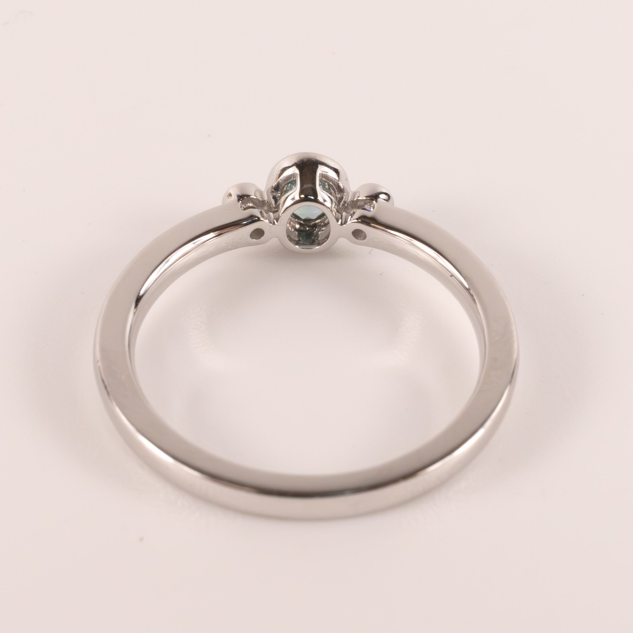 One oval alexandrite is bezel set in 14k white gold. There is 0.18 carat of alexandrite. Diamonds are bezel set on either side of the alexandrite (2 total). There are 0.05 carat of diamonds.