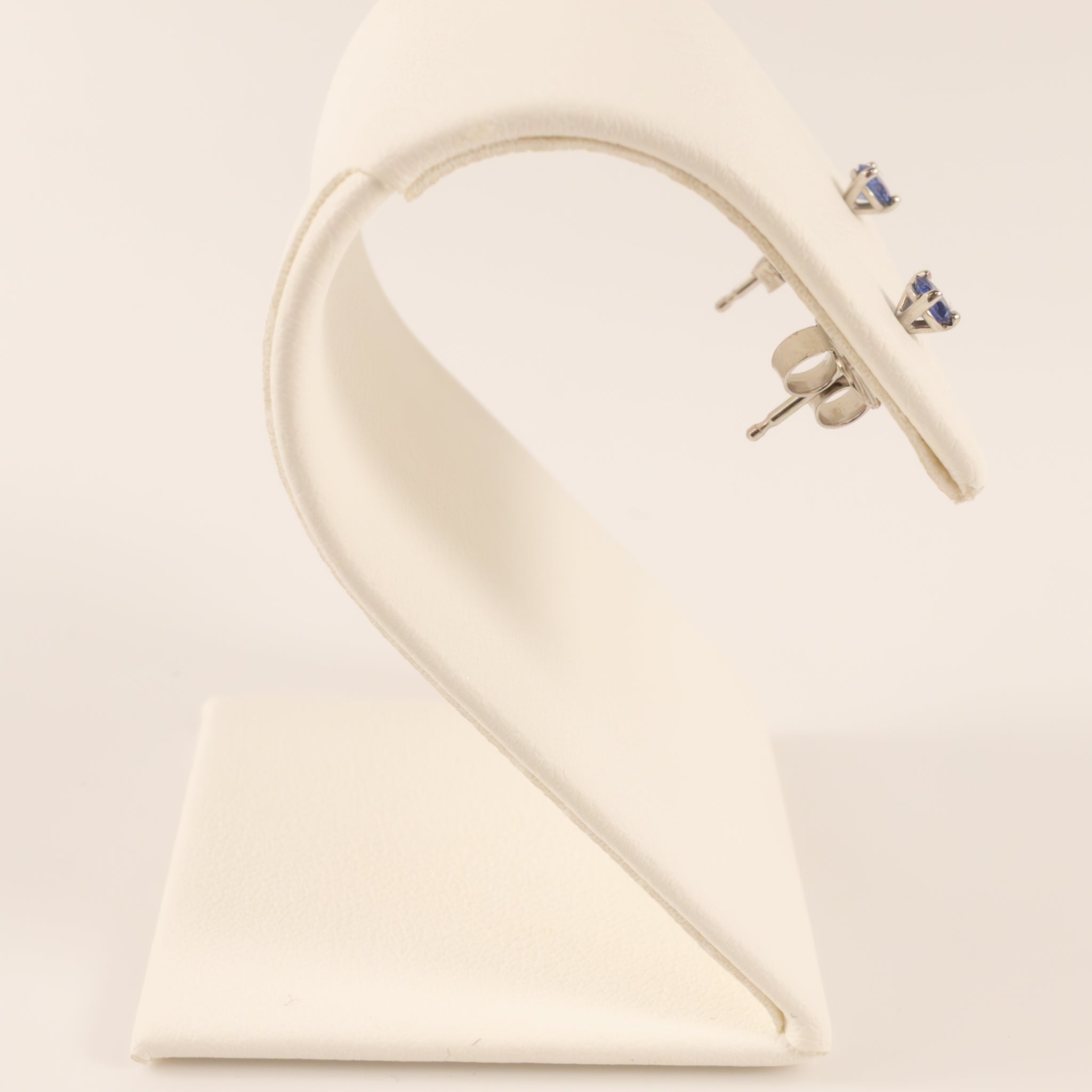 Round 2.75mm blue sapphires are 3-prong set in 14k white gold. There are 0.18 total carats of sapphires.