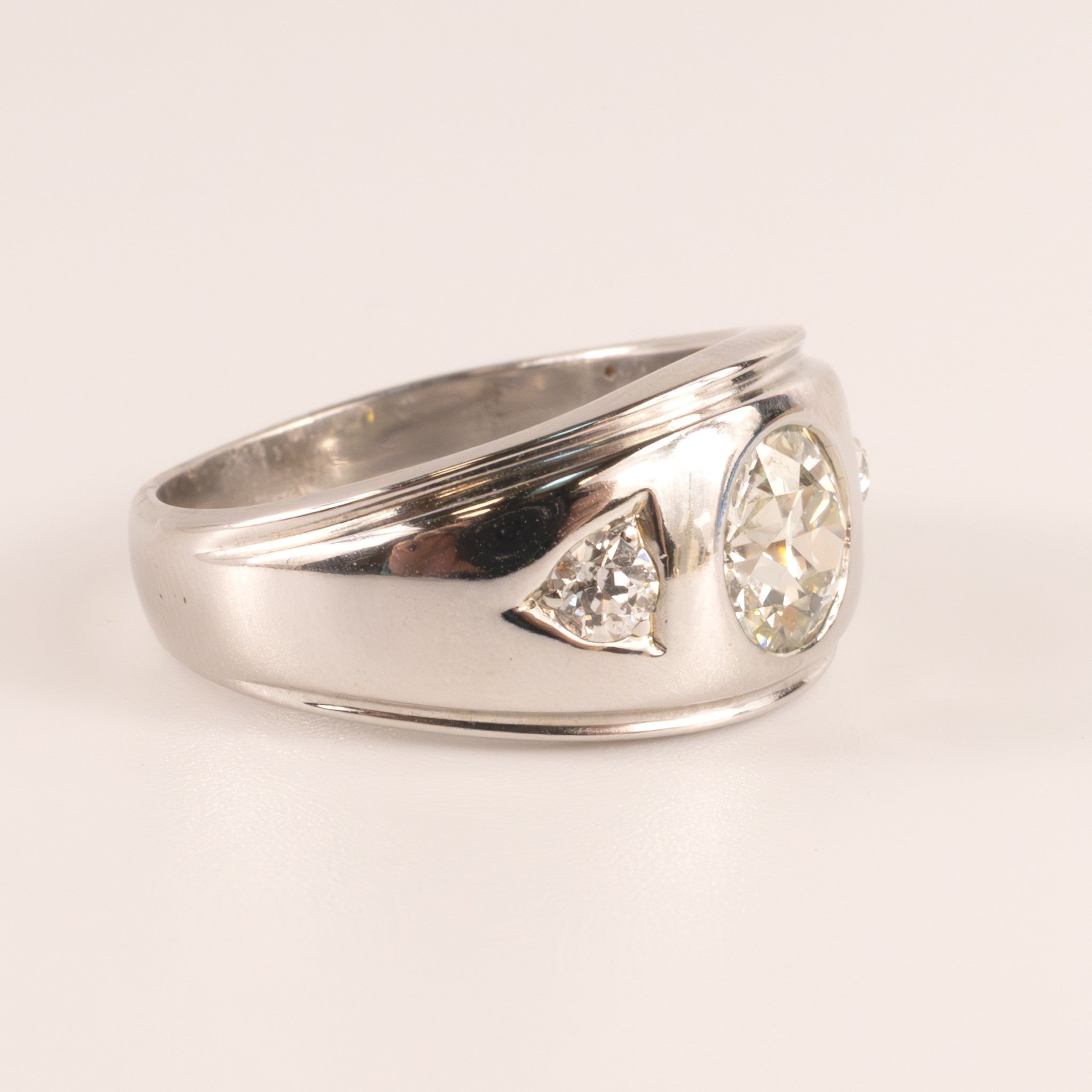 Three euro cut diamonds are set in 14k white gold. The center diamond is 1.35 carats. The color grade is H and the clarity grade is VVS. The side diamonds have a total carat weight of 0.25 carats. The ring is 10.8mm at its widest point.
