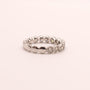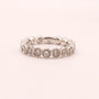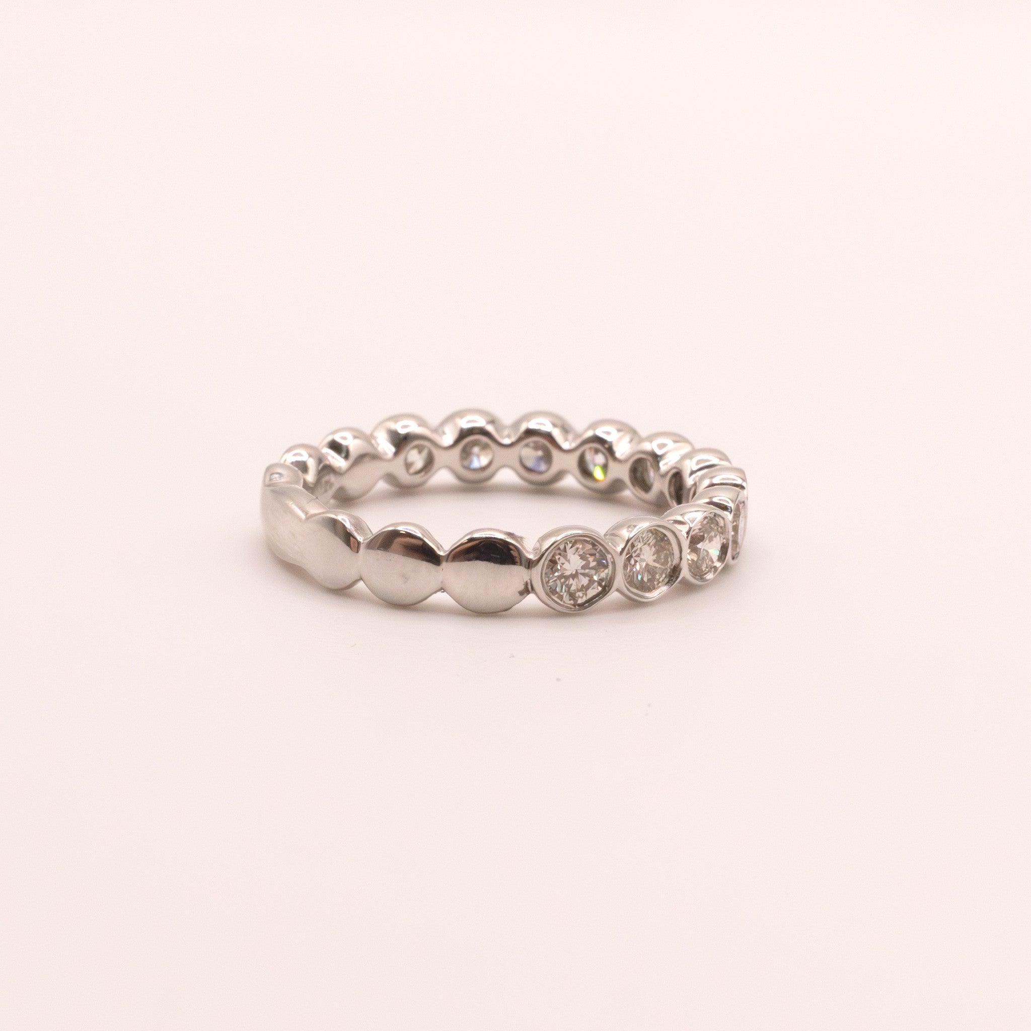 11 diamonds are bezel set in 14k white gold. There are 0.98 total carat weight of diamonds. The ring features round bubble accents. The ring is a size 7. Please reach out for alternative sizing options.