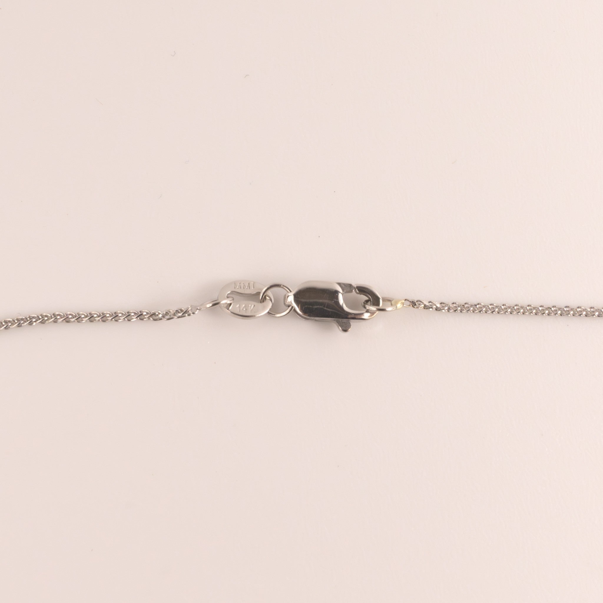 A 0.9mm wide spiga chain is made of 14k white gold. The links of the chain are cut in a way that makes it "sparkle" in direct light. The chain measures 16" long and features a lobster clasp.