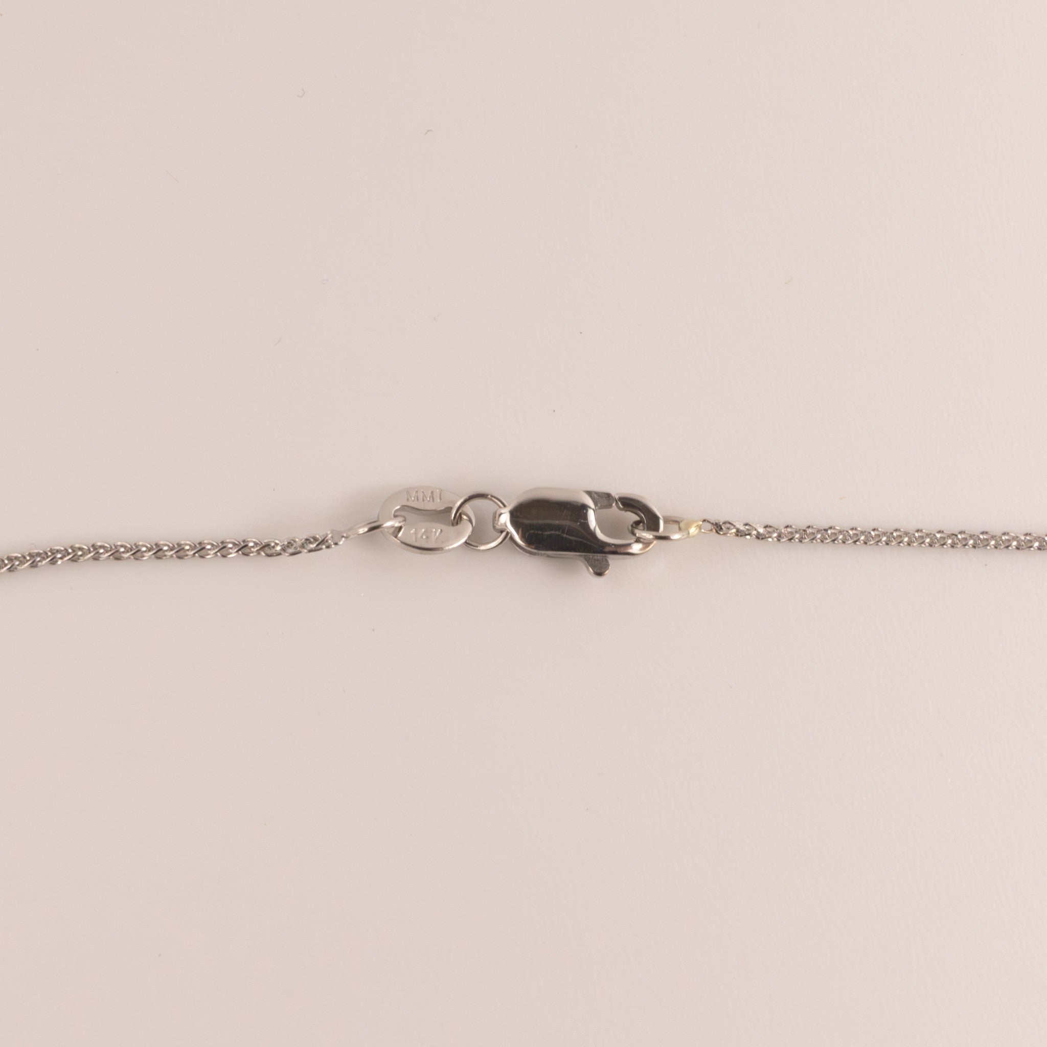 A 0.9mm wide spiga chain is made of 14k white gold. The links of the chain are cut in a way that makes it "sparkle" in direct light. The chain measures 20" long and features a lobster clasp.