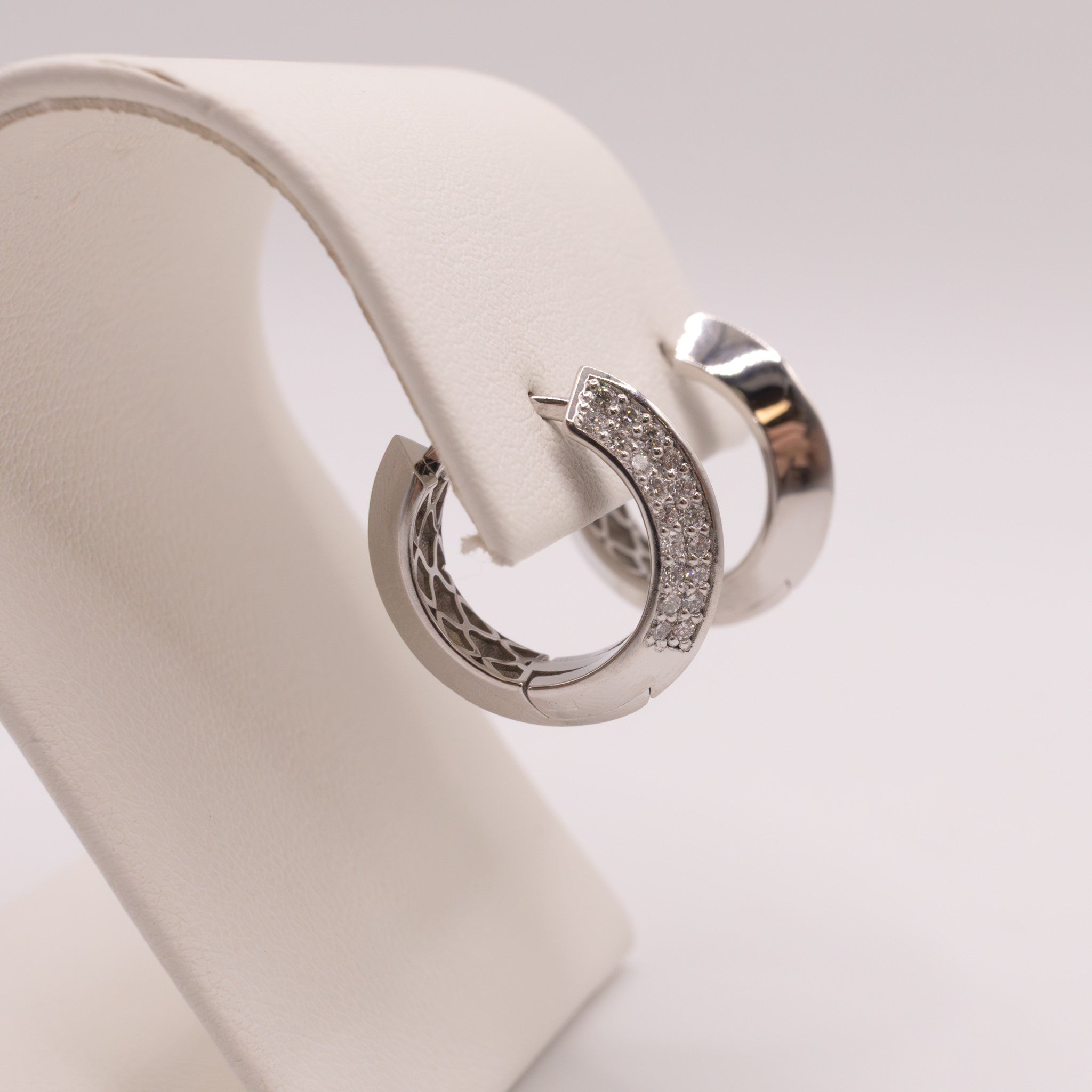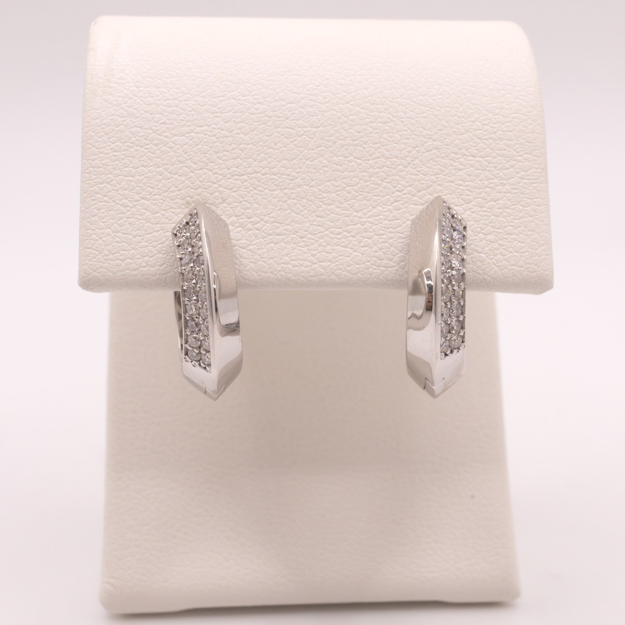 38 diamonds are set on the outer edge of each 14k white gold mountings. There are 0.31 total carat weight of diamonds. The huggies are 4.5mm wide and approximately 1/2" long. The earrings feature a post click-in closure.