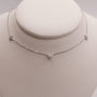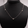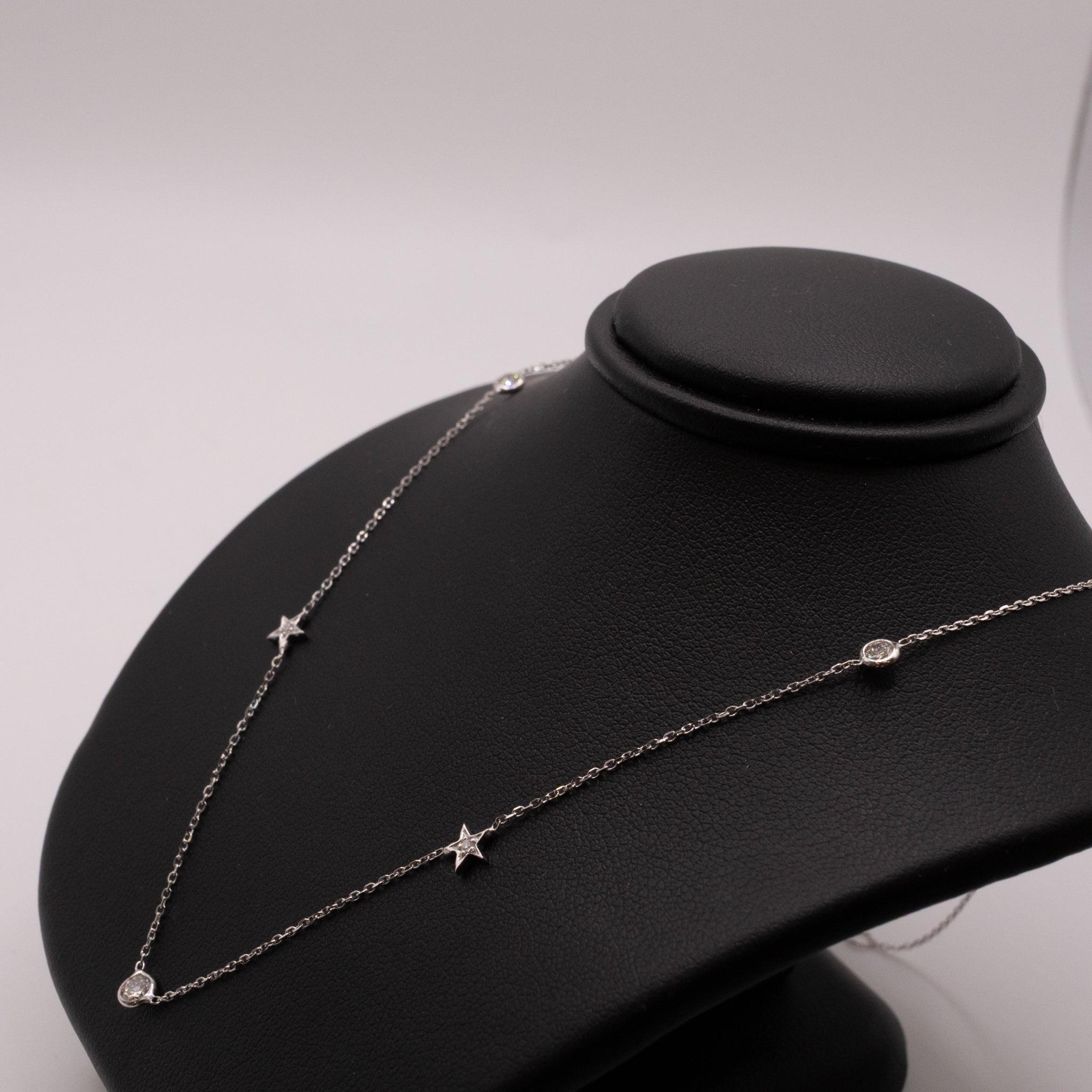 Three round lab grown diamonds bezel set and two lab grown diamonds set in stars of 14k white gold. There are 0.40 total carat weight of diamonds The lab grown diamonds are stationed along an 18" cable chain. 0.90DWT