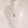 5x4mm oval cut emerald is bezel set in 14k white gold. There is 0.32 carat of emerald. One round diamond is bezel set about the emerald. There is 0.02 carat of diamond. The pendant is approx. 1/2" long.