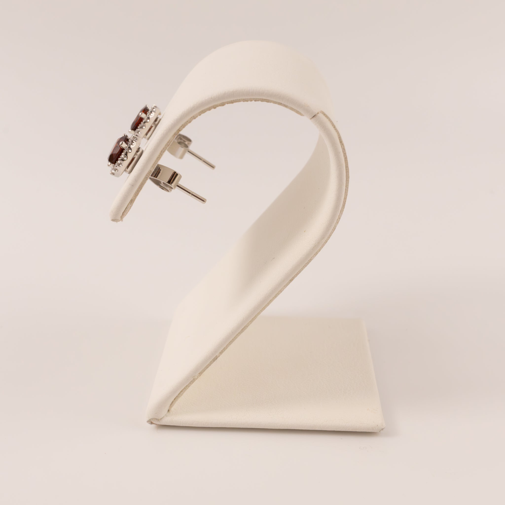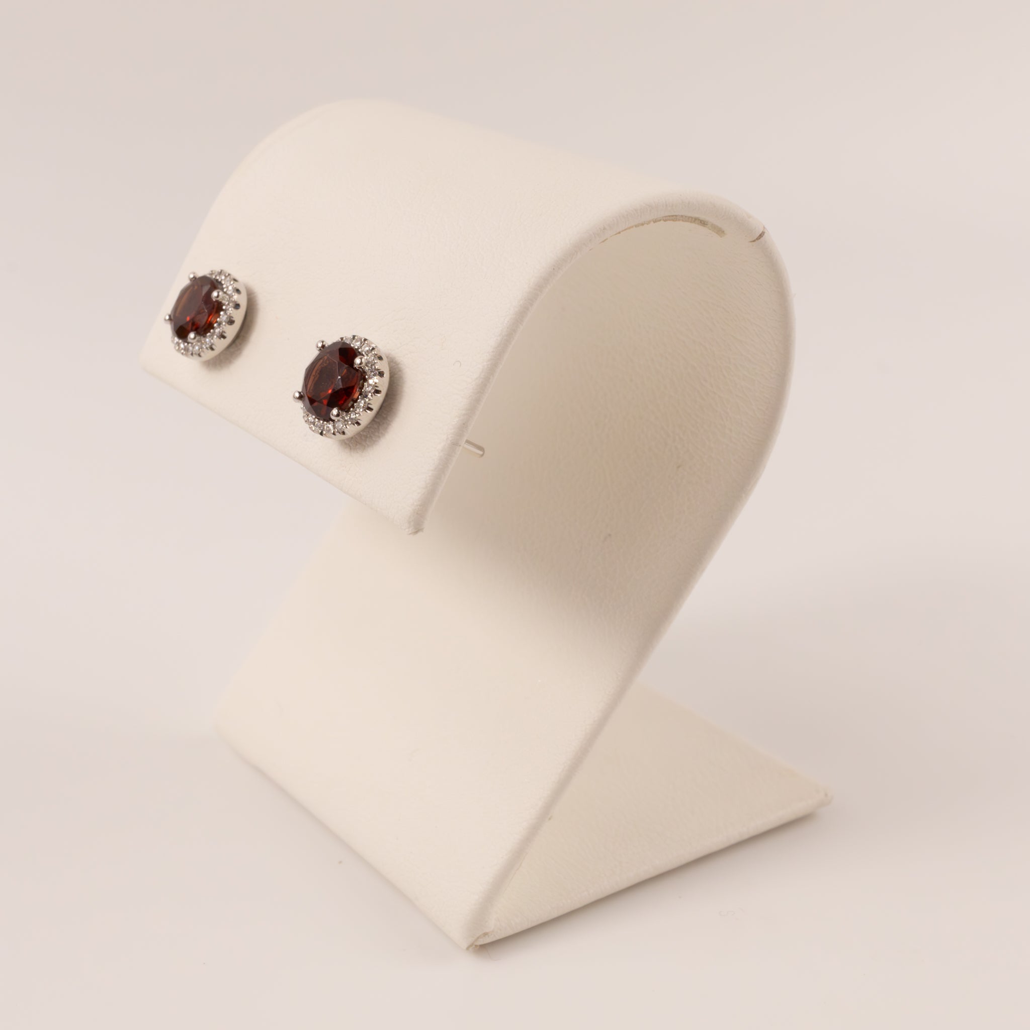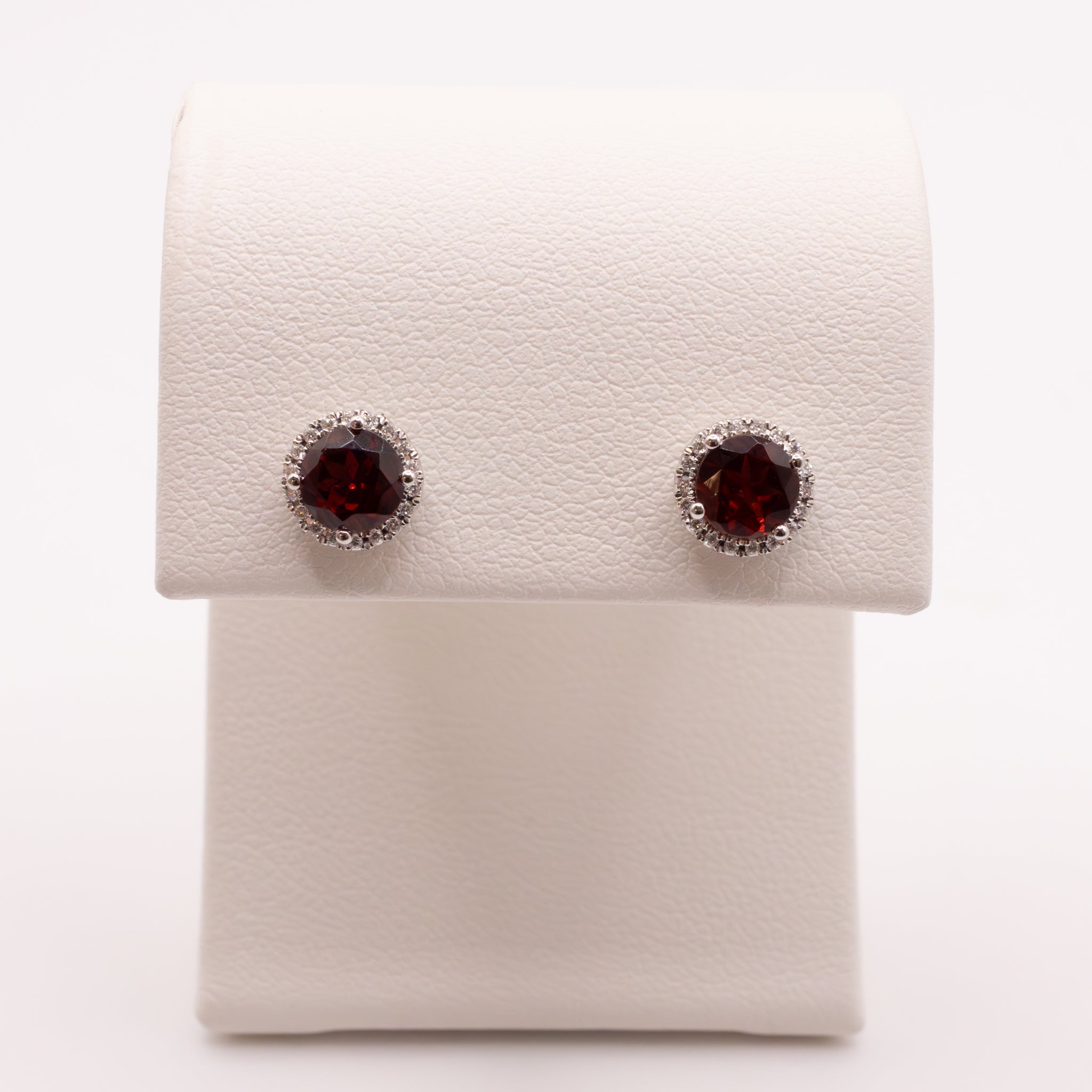 Round garnets are set in 14k white gold. Diamonds are set in halos around each earring. There are 0.07 total carat weight of diamonds.