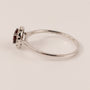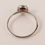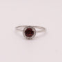 One round garnet is set in 14k white gold. There is 0.63 total carat weight of garnet. The ring features a diamond halo of 1/10 total carat weight of diamonds.