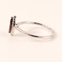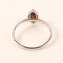 One marquise cut garnet is set in 14k white gold. There is 0.65 total carat weight of garnet. The ring features a diamond halo of 0.05 total carat weight of diamonds.