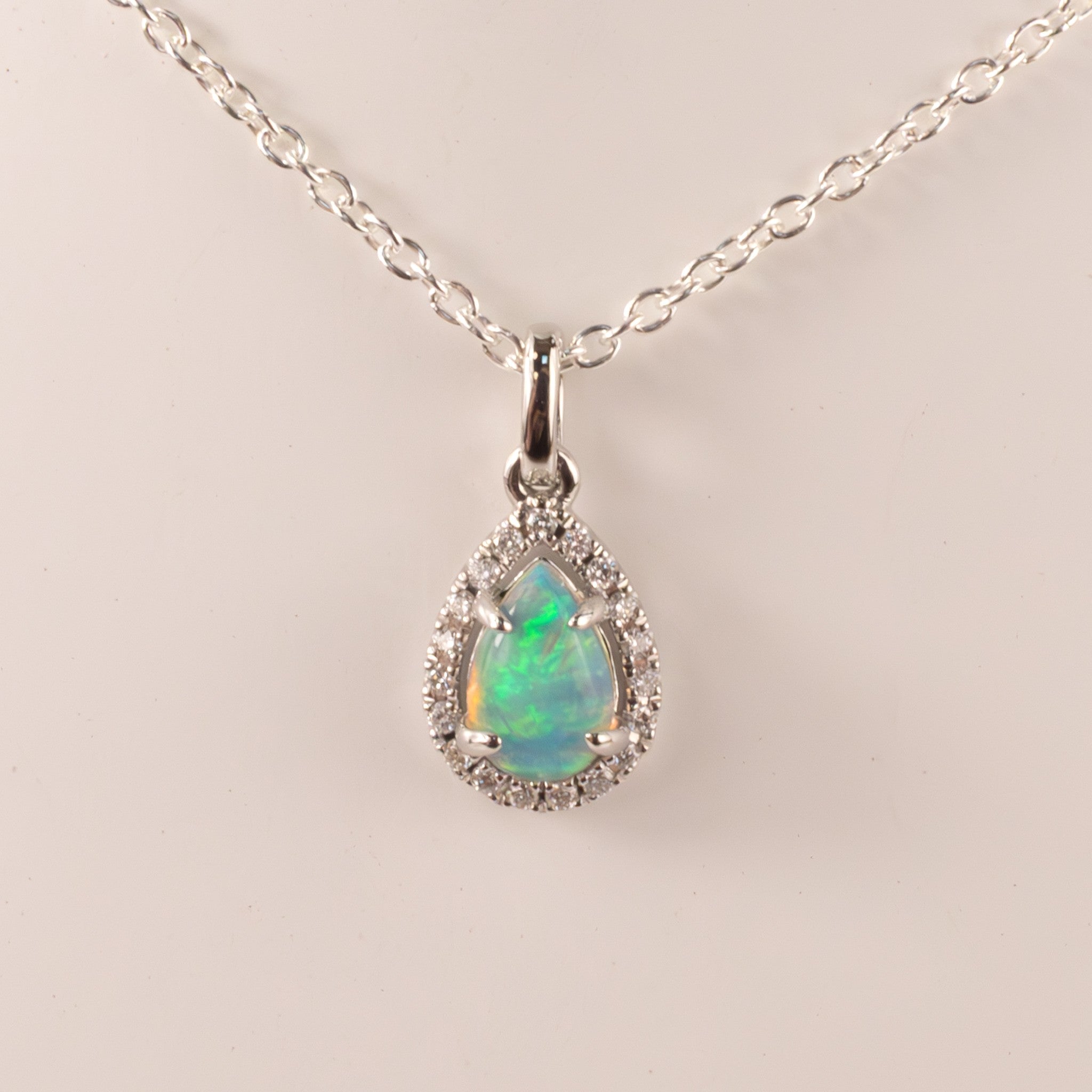 A pear opal is set in 14k white gold. There is 0.23 total carats of opal. Round diamonds are set around the opal. There are 0.05 total carats of diamonds. The pendant measures 13x6mm.