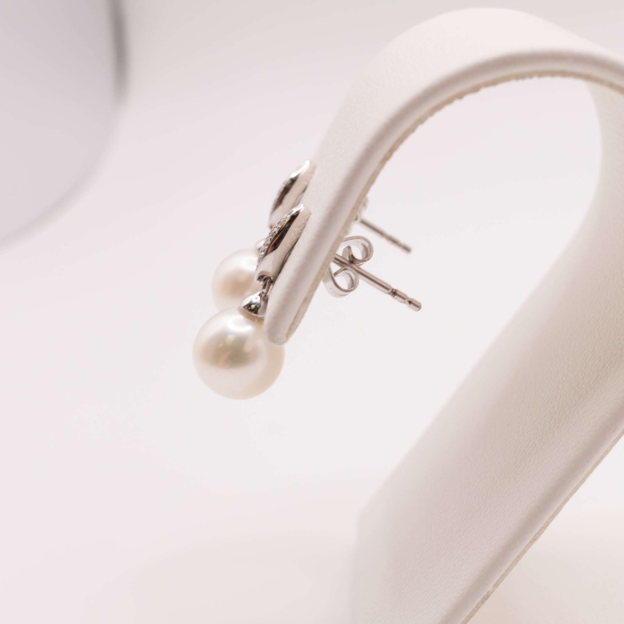 7mm pearls and pave set diamonds are on each 14k white gold mounting. There are 0.05 total carat weight of diamonds. The earrings measure 8x16mm in total size.