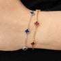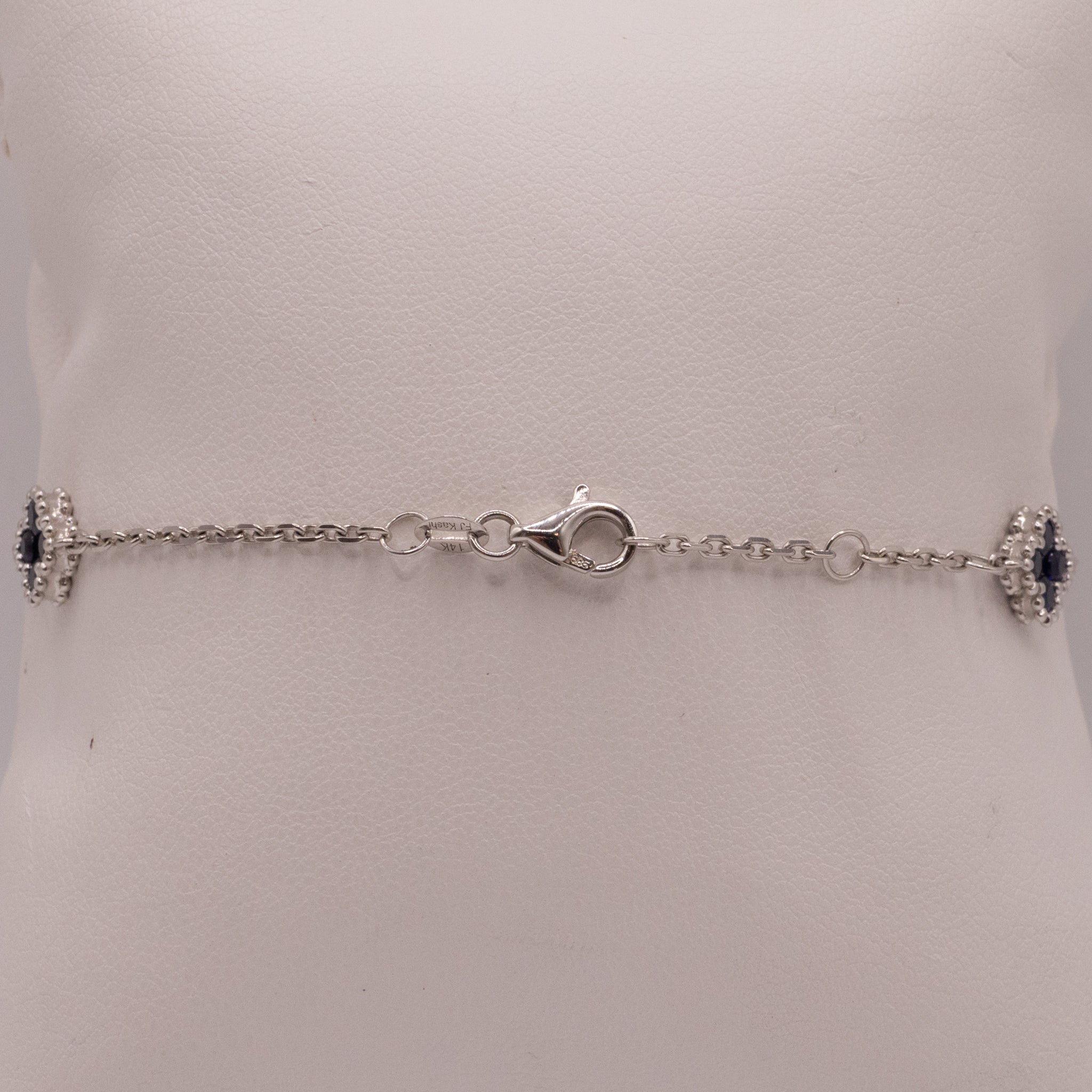 Five sapphires are set in each 14k white gold mounting. Five segments are stationed on a 7" cable chain. There are 1.69 total carat weight of sapphires.