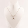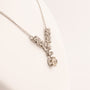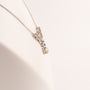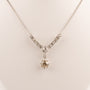 One European cut diamond and 10 round diamonds are prong set and stationed in 14k white gold. The Euro. cut diamond is 0.75 carats with a color grading of O-P and clarity VS2. The 10 round diamonds are 0.35 total carat weight of diamonds. The diamonds are stationed on a 14k white gold baby curb chain. The necklace measures 17" in length. The necklace features a spring ring clasp.