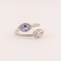 Marquise shaped tanzanite and marquise shaped diamond are prong set in 14k white gold. There are 0.37 carats of tanzanite. The marquise shaped diamond is 0.30 carats. Both stones feature diamond halos and there are diamonds along the shank. There are 0.44 total carat weight of accent diamonds.