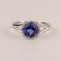 One cushion cut tanzanite is set in 14k white gold. There are 1.50 carats of tanzanite.