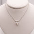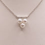 Three pearls are set in 14k white gold. 8 round diamonds are set in a 14k white gold bar above the three pearls. There are 0.04 total carat weight of diamonds. The pendant is fixed on a n 18" cable chain with a spring ring clasp.