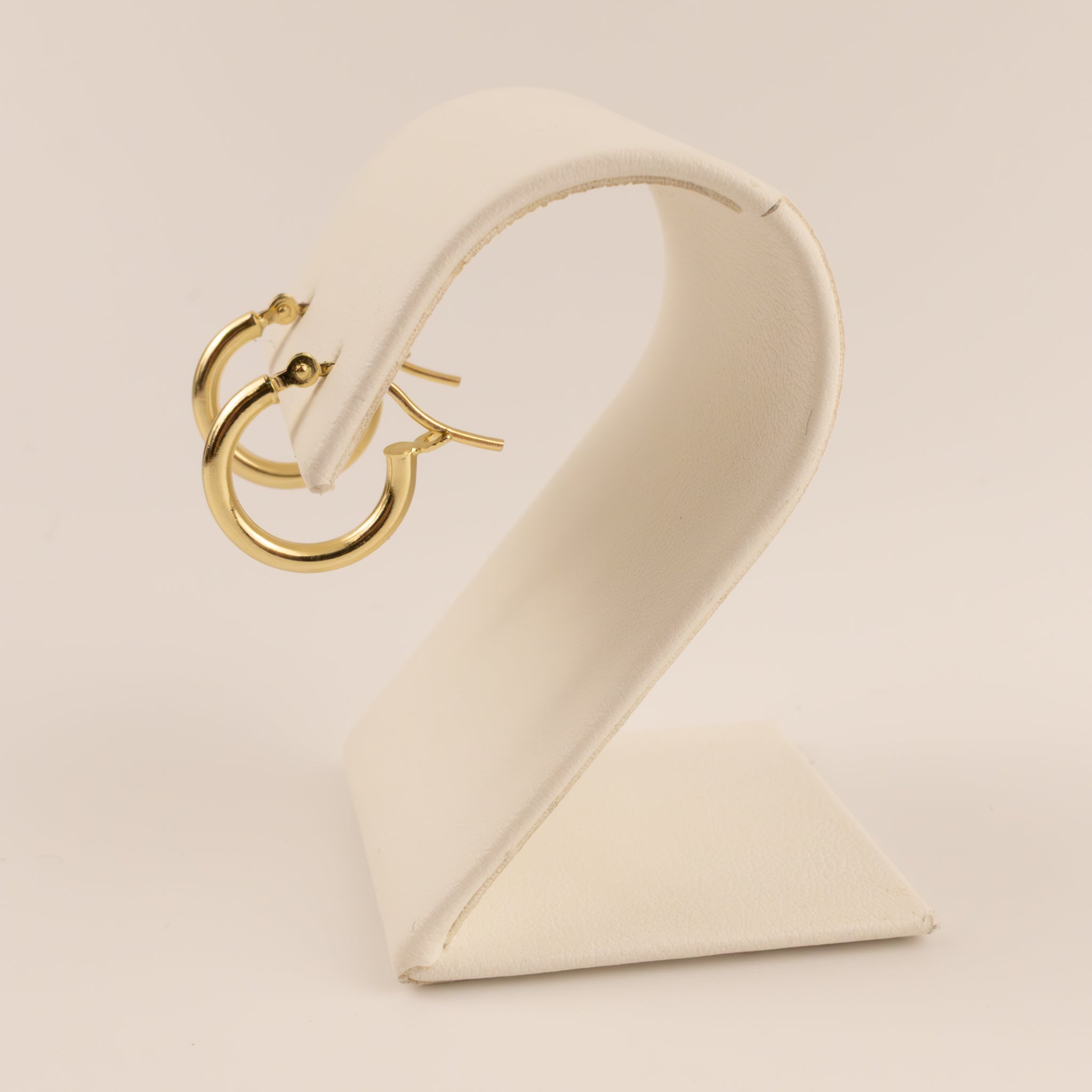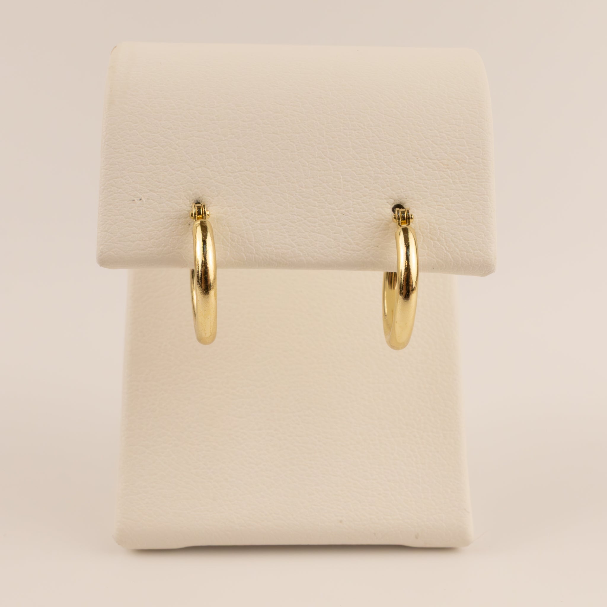 Hollow tube hoops are made of 14k yellow gold. The earrings measure 2x12mm. They feature a wire and clutch closure