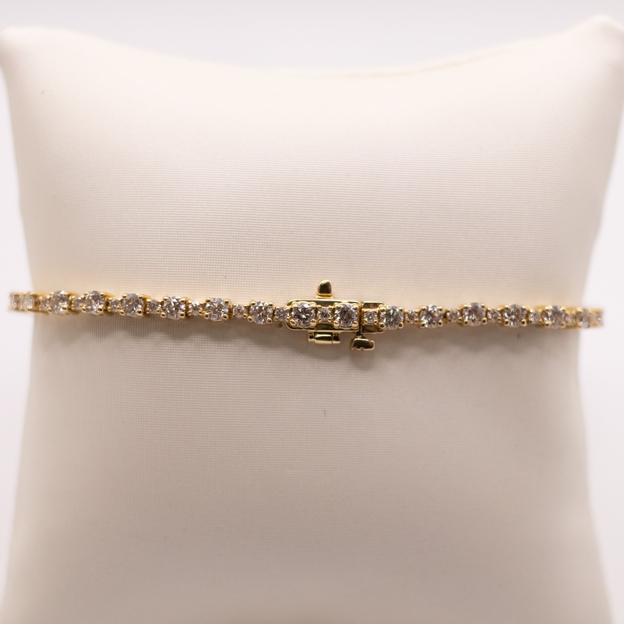 Round diamonds that alternate in size are prong set in 14k yellow gold. There are 3.22 total carat weight of diamonds. The bracelet is 7" long and features a safety latch clasp.