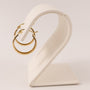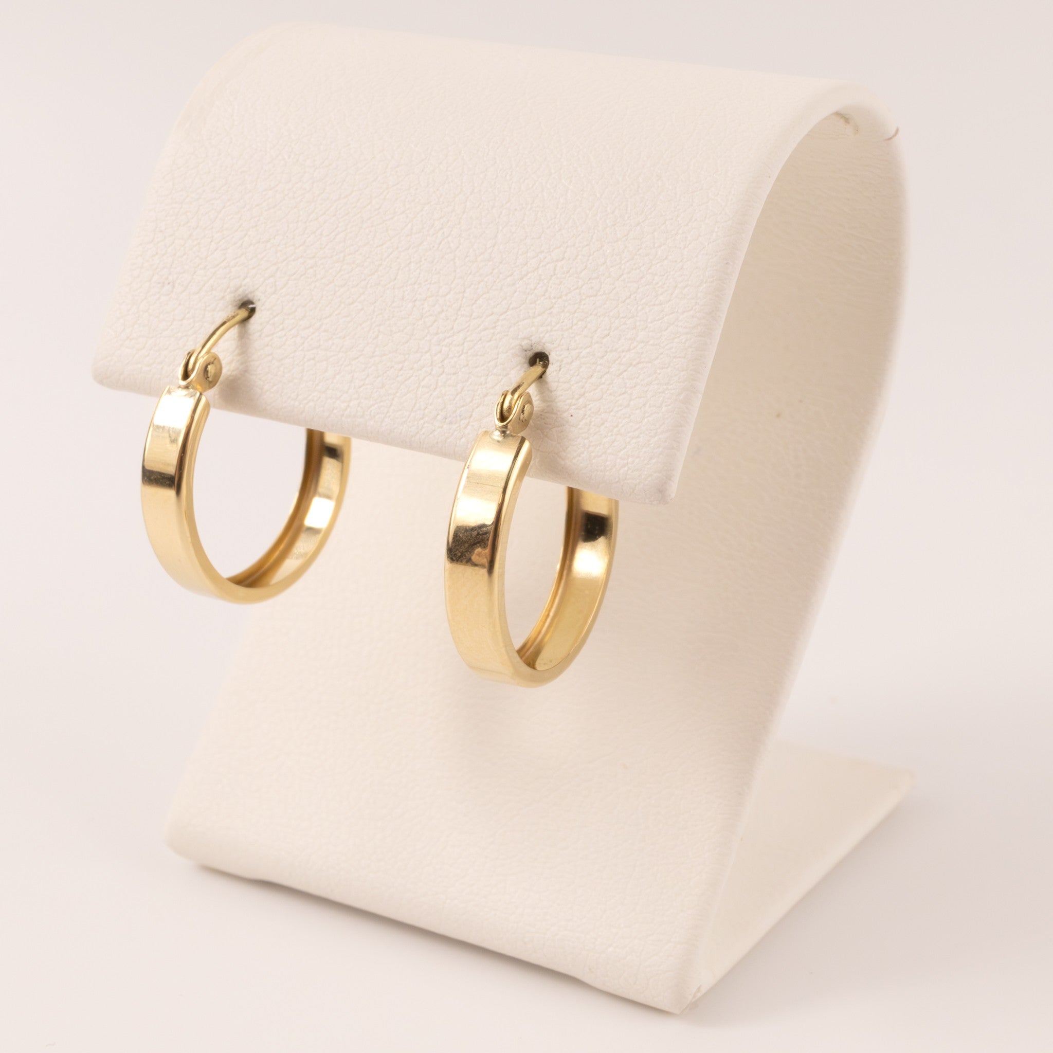 Flat profile hoop earrings are made of 14k yellow gold. The earrings measure 3x14mm. They feature a wire and clutch closure.
