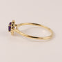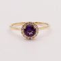 One round amethyst is set in 14k yellow gold. There is 0.41 total carat weight of amethyst. The ring features a diamond halo of 0.10 total carat weight of diamonds.