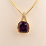 Checkerboard cut 8mm cushion amethyst is bezel set in 14k yellow gold. The pendant features diamonds along its split bail. There is 1.81 carats of amethyst. There are 0.07 total carat weight of diamonds.