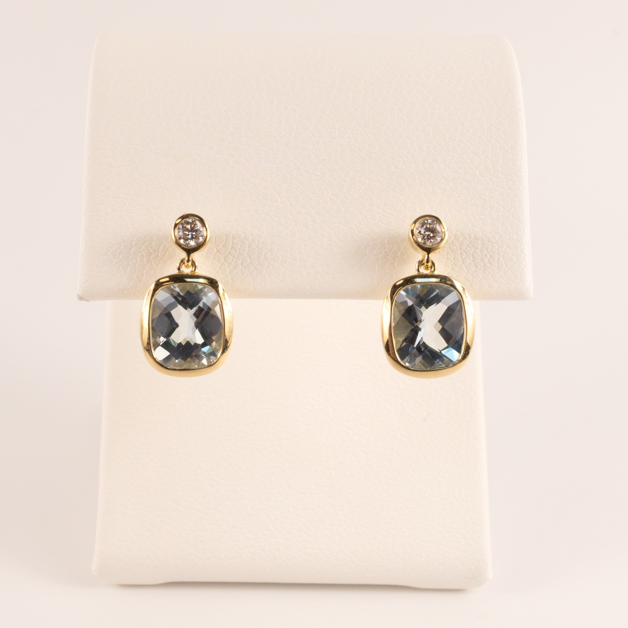 14KYG Aquamarine and Diamond Bezel Set Drop Earrings