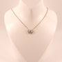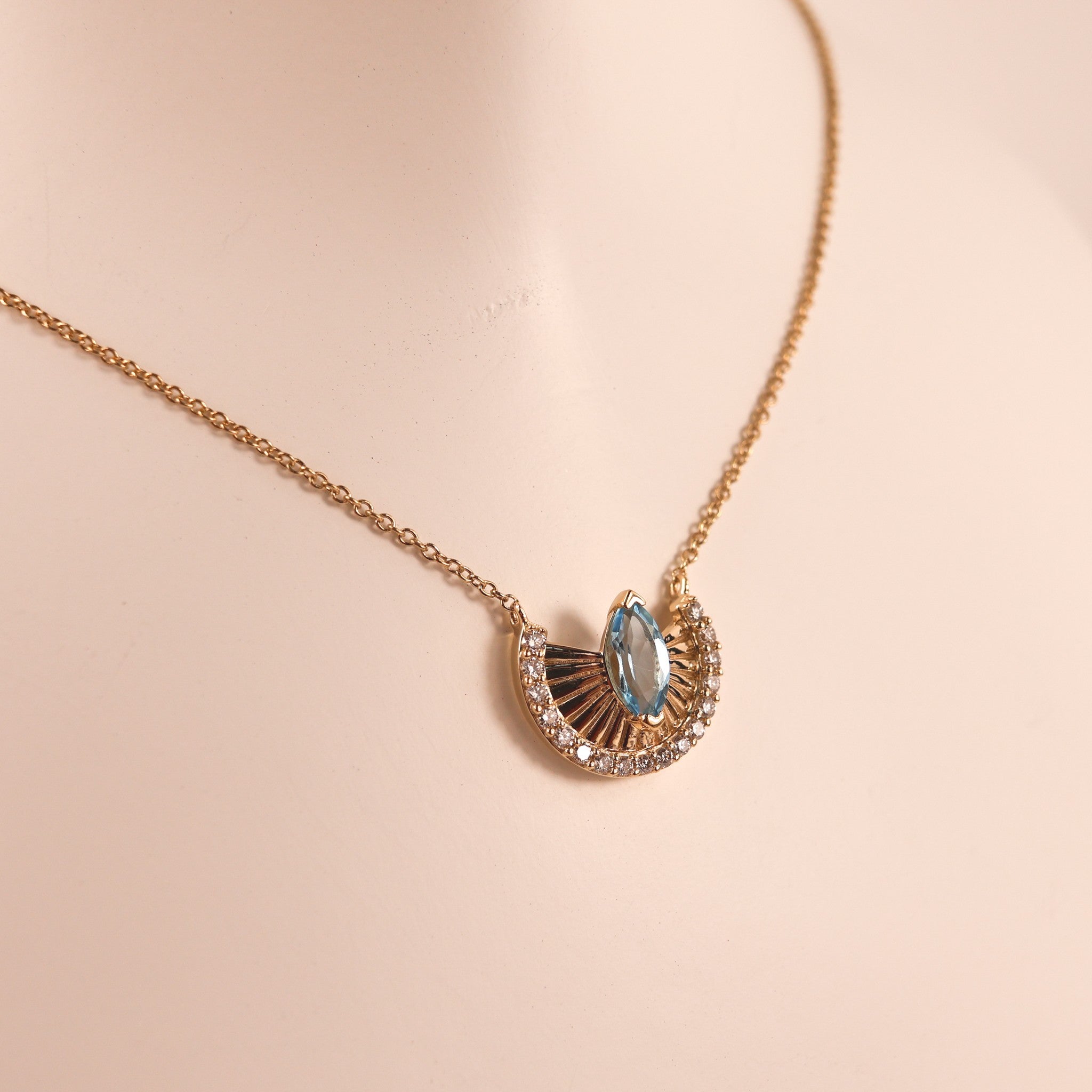 One marquise blue topaz is set in 14k yellow gold. There is 0.45 carats of blue topaz. Round diamonds are set in a semi-circle on the pendant. There are 0.16 total carats of diamonds. The necklace is fixed on a 16-18" cable chain