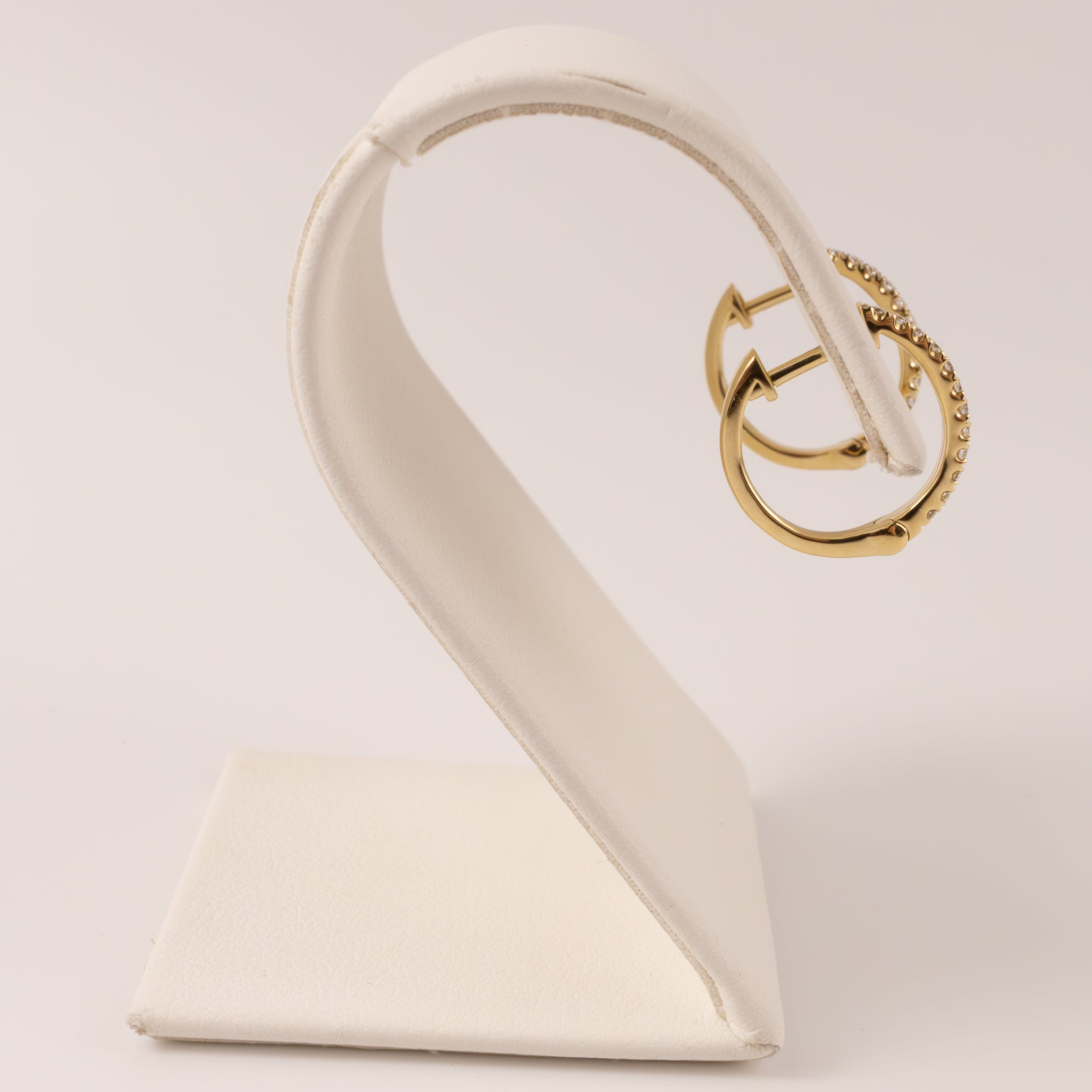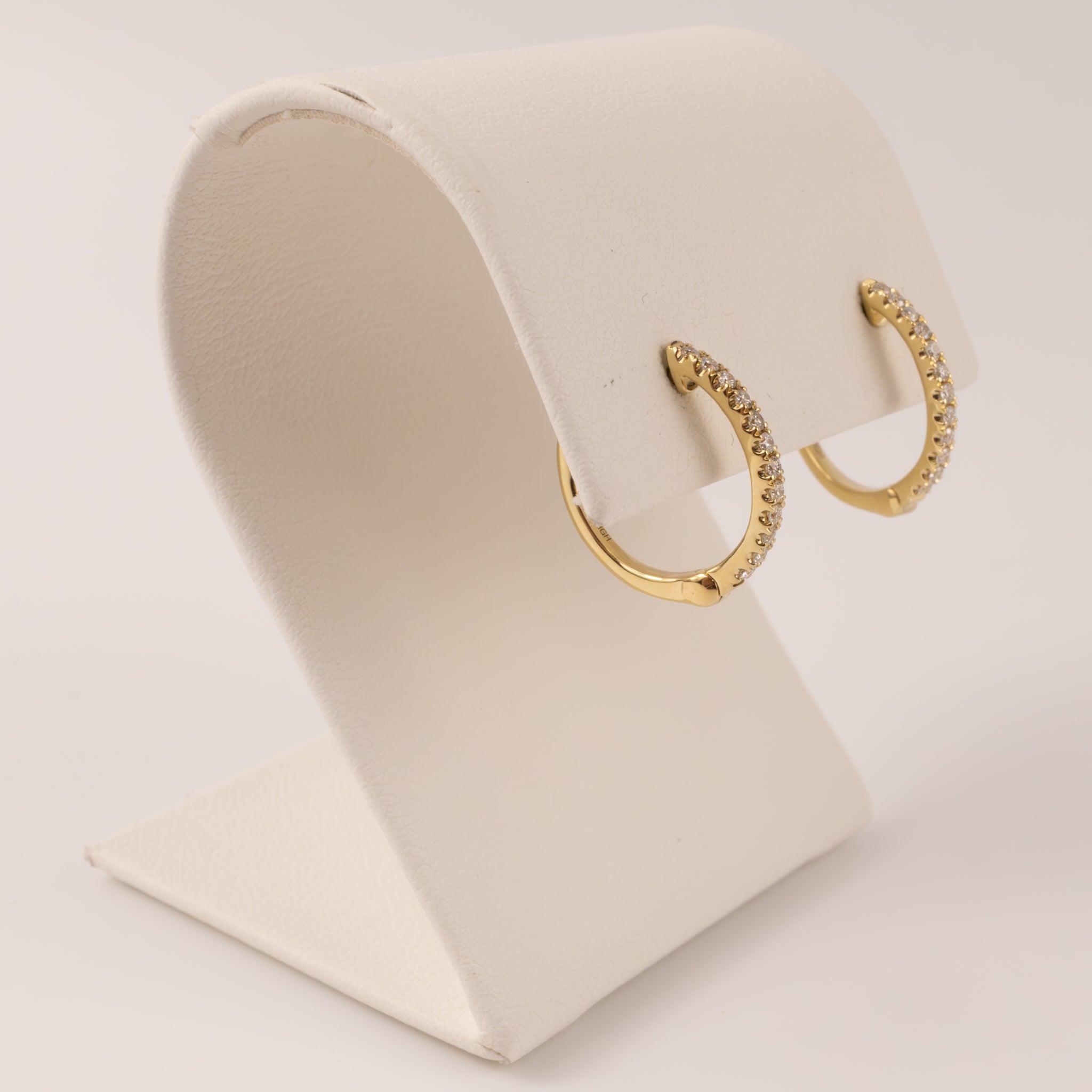 Round diamonds are set in 14k yellow gold. There are 0.125 total carat weight of diamonds. The earrings feature a post hinged closure.