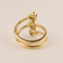A trillion-cut diamond, a round diamond, and an emerald cut diamond are set in 14k yellow gold. There are 0.76 total carats of these center stone diamonds. Round accent diamonds are set in halos around the center stones and along the shank. There are 0.70 total carats of accent diamonds.