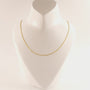 A 0.9mm wide spiga chain is made of 14k yellow gold. The links of the chain are cut in a way that makes it "sparkle" in direct light. The chain measures 18" long and features a lobster clasp.