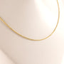 A 0.9mm wide spiga chain is made of 14k yellow gold. The links of the chain are cut in a way that makes it "sparkle" in direct light. The chain measures 18" long and features a lobster clasp.
