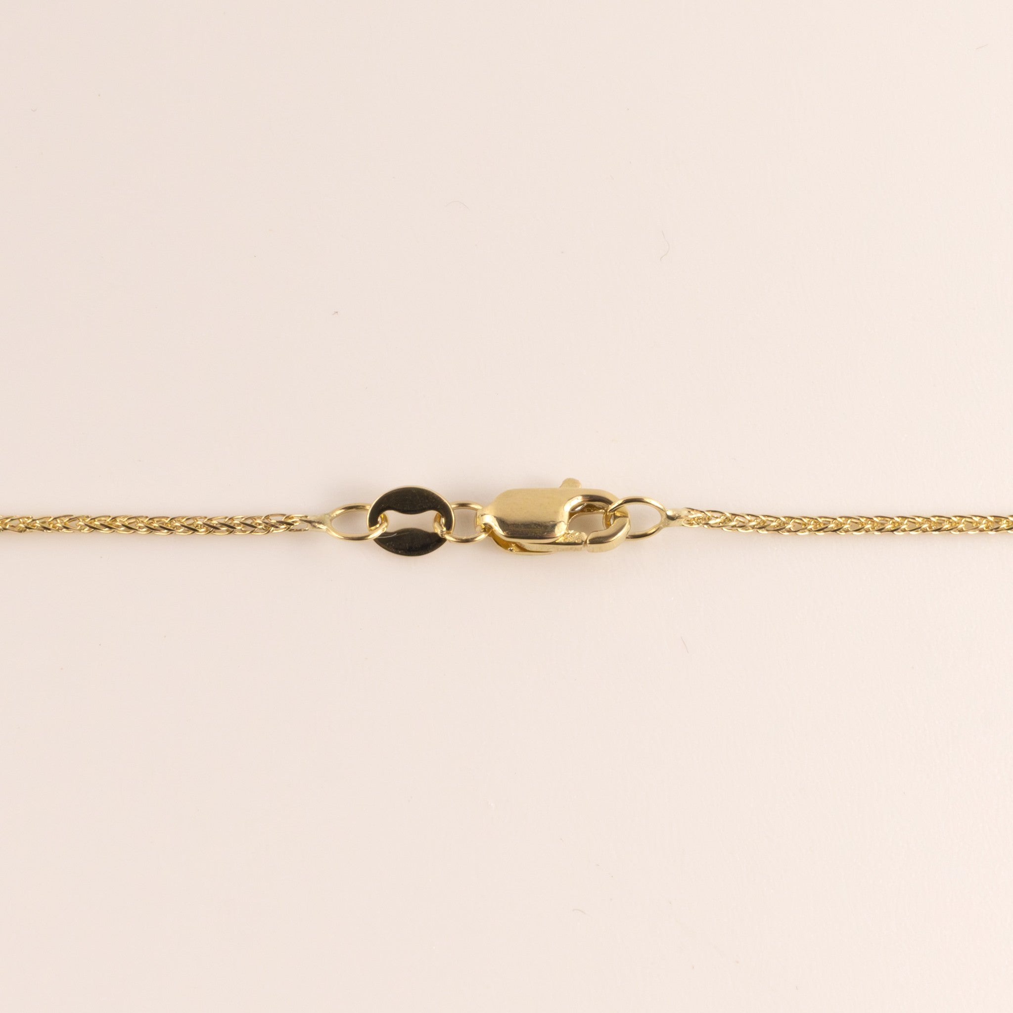 A 0.9mm wide spiga chain is made of 14k yellow gold. The links of the chain are cut in a way that makes it "sparkle" in direct light. The chain measures 18" long and features a lobster clasp.