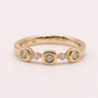 Five diamonds are set in 14k yellow gold. There are 0.19 total carat weight of diamonds. The ring is a size 7 . Please reach out about alternative sizing options.