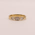 One oval cut and two pear cut diamonds are bezel set in 14k yellow gold. The oval diamond is 0.23 total carats. The pear diamonds have 0.18 total carat weight. The ring features engraved lines.