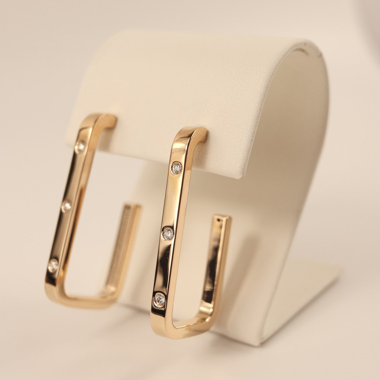 Three round diamonds are flush set in each 14k yellow gold hoop earring. There are 0.11 total carat weight of diamonds.