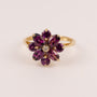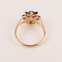 Rhodolite garnets are set in 14k yellow gold. There are four 5x3mm ovals and four 3mm round garnets surrounding one bezel set diamond. There is 0.01 carats of diamond.