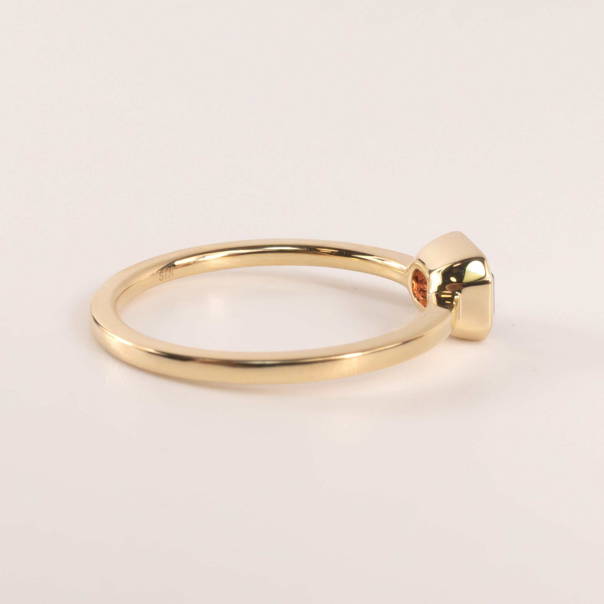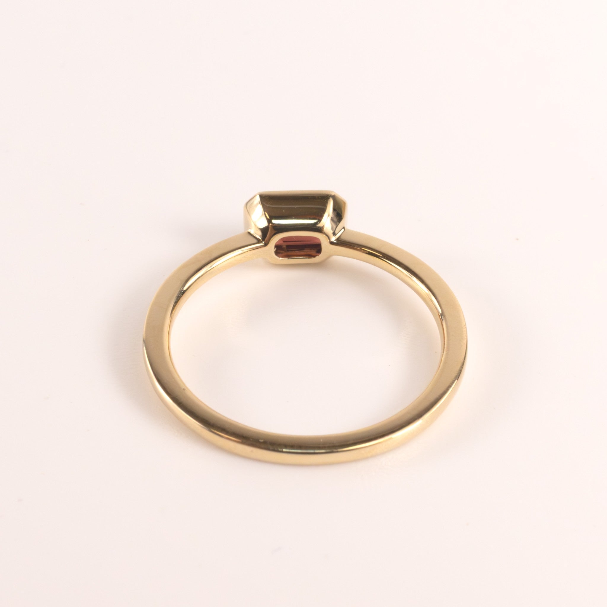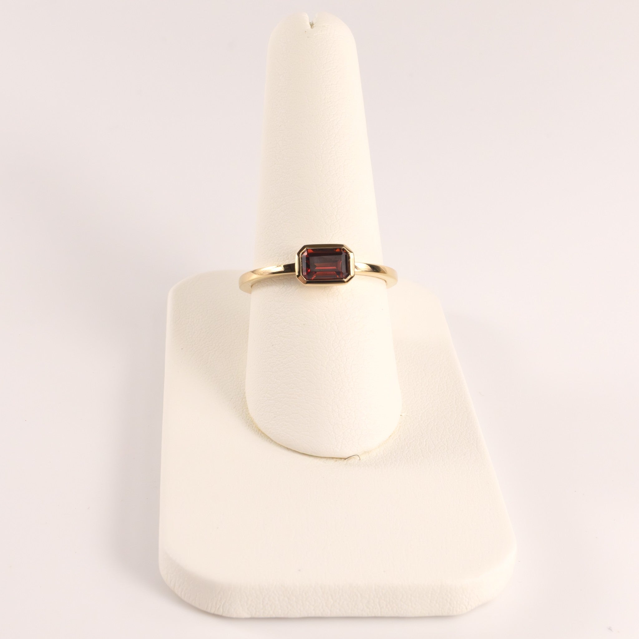6x4mm emerald cut garnet is bezel set in 14k yellow gold. There is 0.80 carat of garnet. The stone is set east-west.
