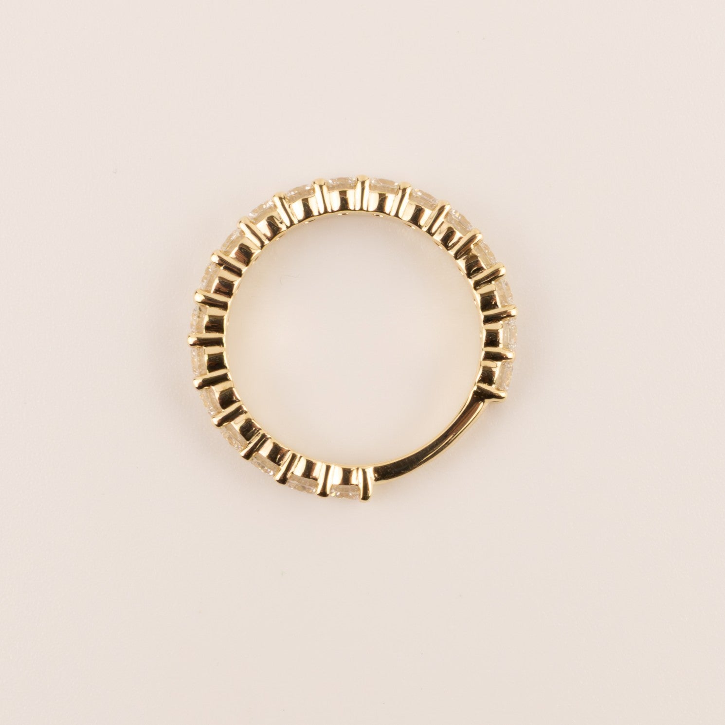 2.8mm round lab grown diamonds are shared prong set in 14k yellow gold. There are 1.33 total carat weight of diamonds. The diamonds are featured 3/4 around the band.
