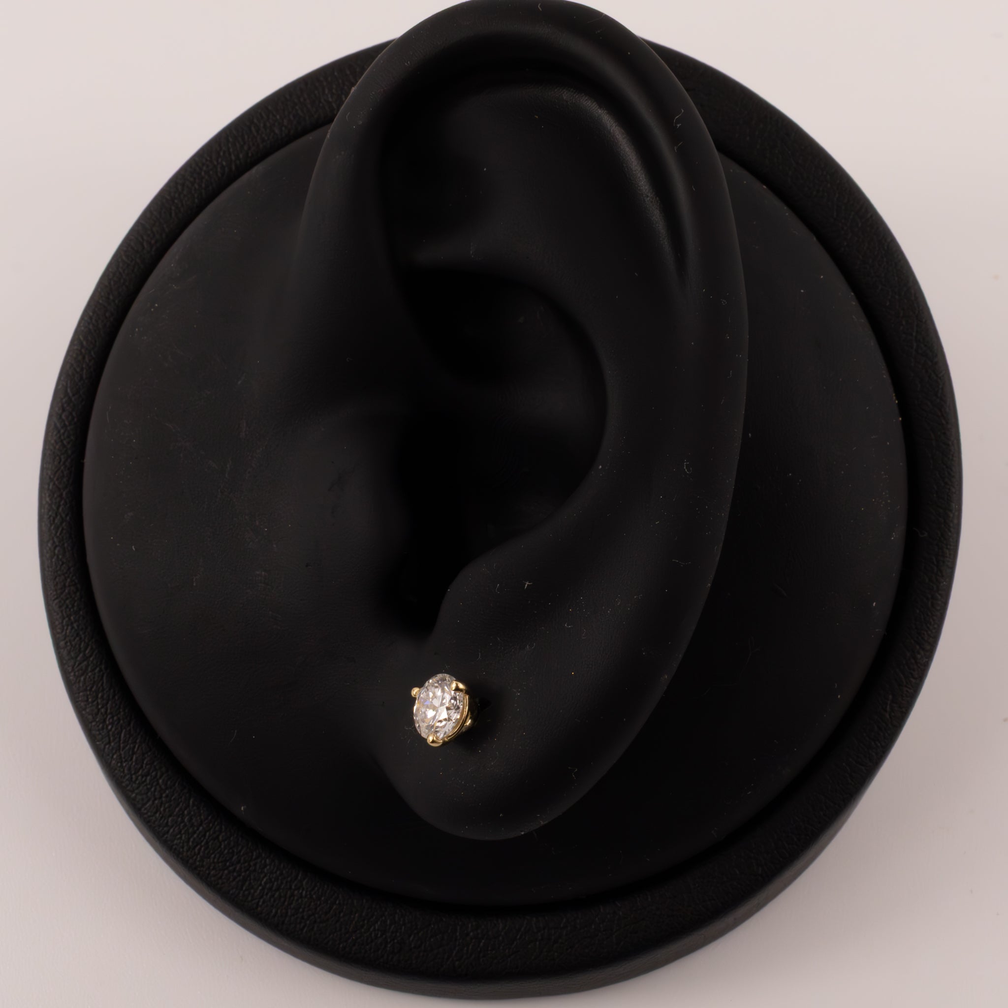 Round lab grown diamonds are 3-prong set in 14k yellow gold. There are 0.75 total carat weight of diamonds.