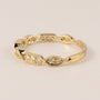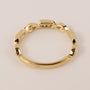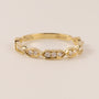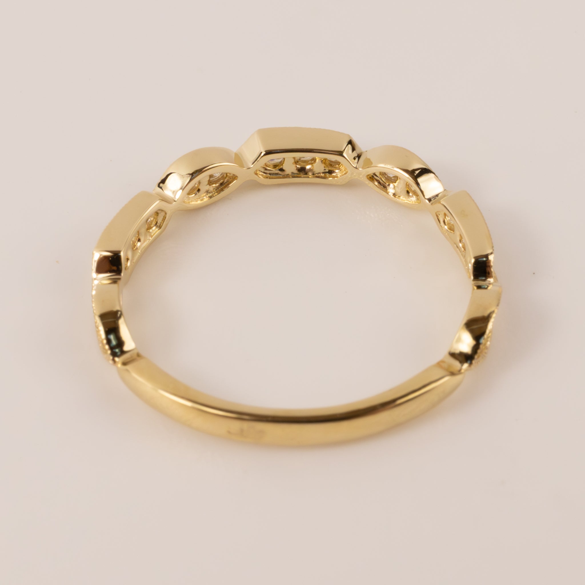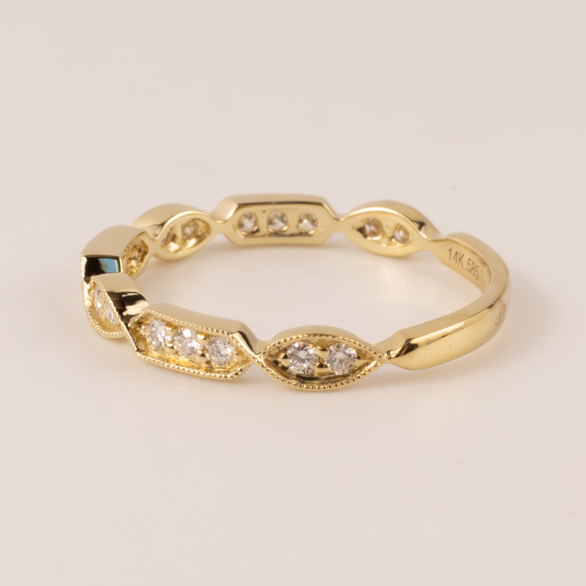 Round diamonds are set in 14k yellow gold. There are 0.20 carats of diamonds. The ring features a milgrain accented twist design.