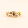Multi-color sapphire and diamond stones are bezel set through out a 14k yellow gold mounting. There are 0.44 total carats of sapphire. There are 0.14 total carats of diamonds.
