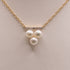 Three pearls are set in 14k yellow gold. 8 round diamonds are set in a 14k yellow gold bar above the three pearls. There are 0.04 total carat weight of diamonds. The pendant is fixed on a n 18" cable chain with a spring ring clasp.