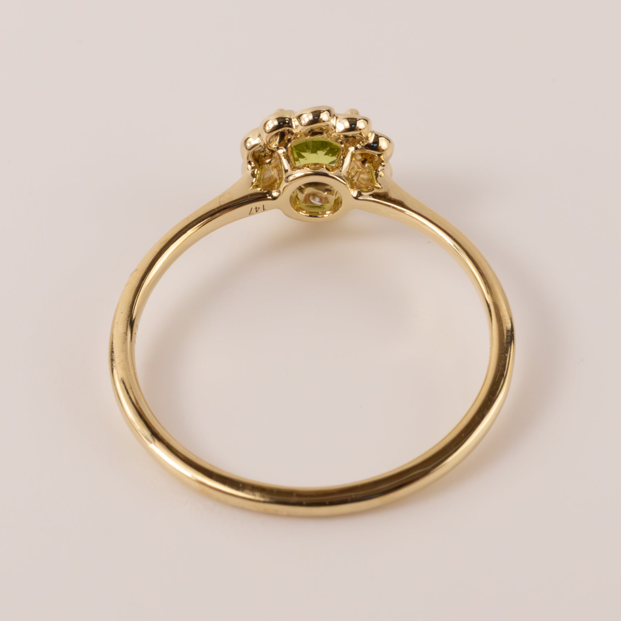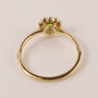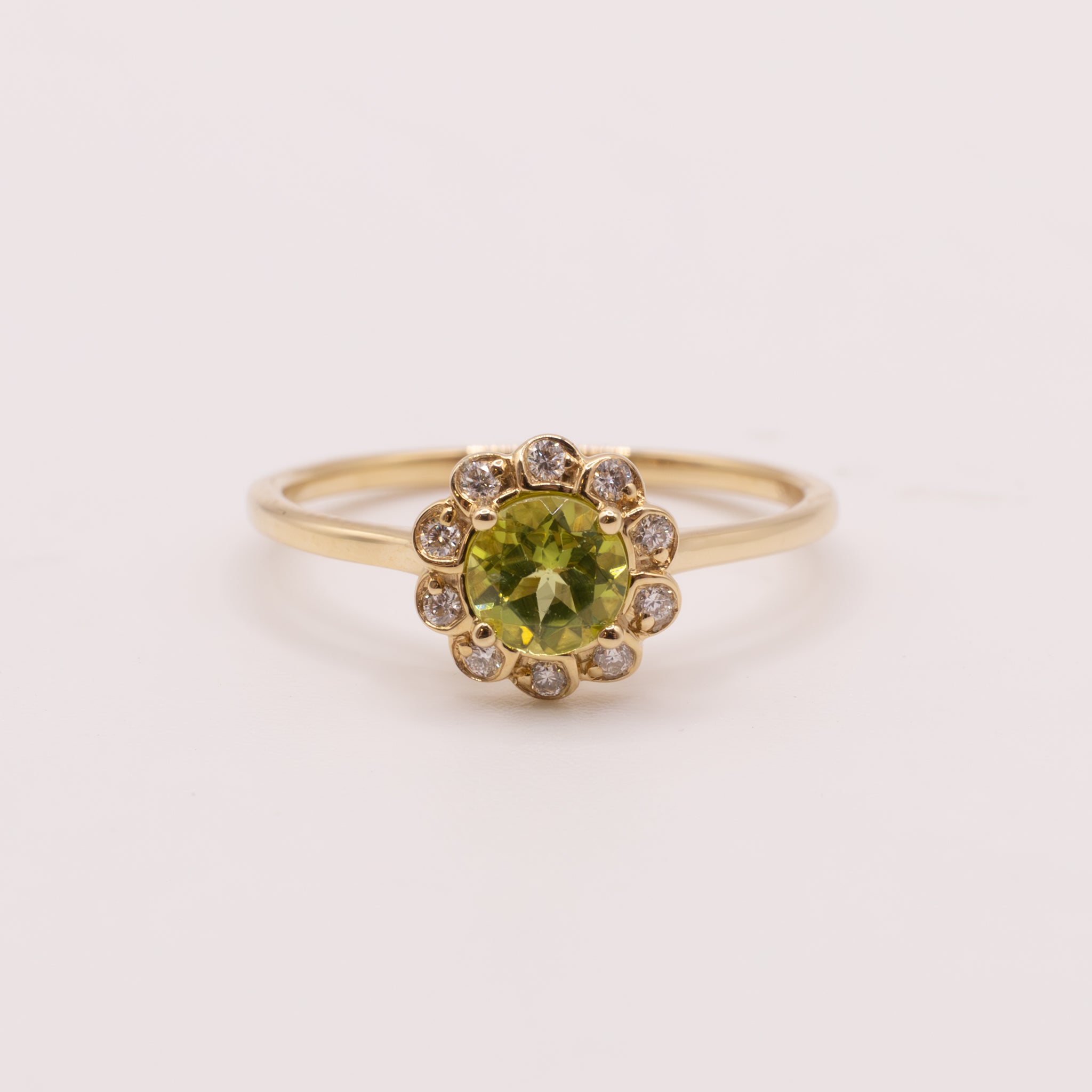 One round peridot is set in 14k yellow gold. Diamonds are set around the peridot in a flowerlike halo. There are 0.08 total carat weight of diamonds.