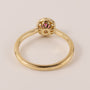 One round pink tourmaline is set in 14k yellow gold. There are 0.27 carats of pink tourmaline. Round diamonds are set in a halo. There are 0.14 total carats of diamonds.