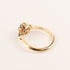 One round rhodolite garnet is 4-prong set in 14k yellow gold. The garnet is surrounded by a floral diamond halo. There is 1.40ct of rhodolite garnet. There are 0.07 total carat weight of diamonds.