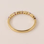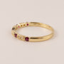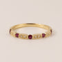 Five rubies are channel set in 14k yellow gold. There are 0.20 total carats of rubies. Diamonds are prong set in sets of two between each ruby (8 total). There are 0.03 total carats of diamonds.