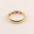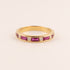 Baguette rubies and round diamonds are channel set in 14k yellow gold. There are 0.65 total carat weight of rubies. There is 0.17 total carat weight of diamonds.