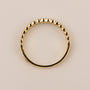 Diamonds are set in 14k yellow gold. There are 0.38 total carats of diamond. The ring features one flat edge to stack with other rings. The other side features milgrain scallop details.